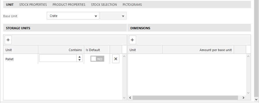 - In the Contains column, fill in a number or use the up/down arrow buttons to define how many base units a storage unit contains, for example a pallet is comprised of 22 crates.